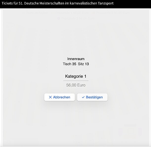 Nachdem Sie die Sitzplätze ausgewählt haben, öffnet sich ein Fenster zur Bestätigung der Bestellung (siehe Foto).