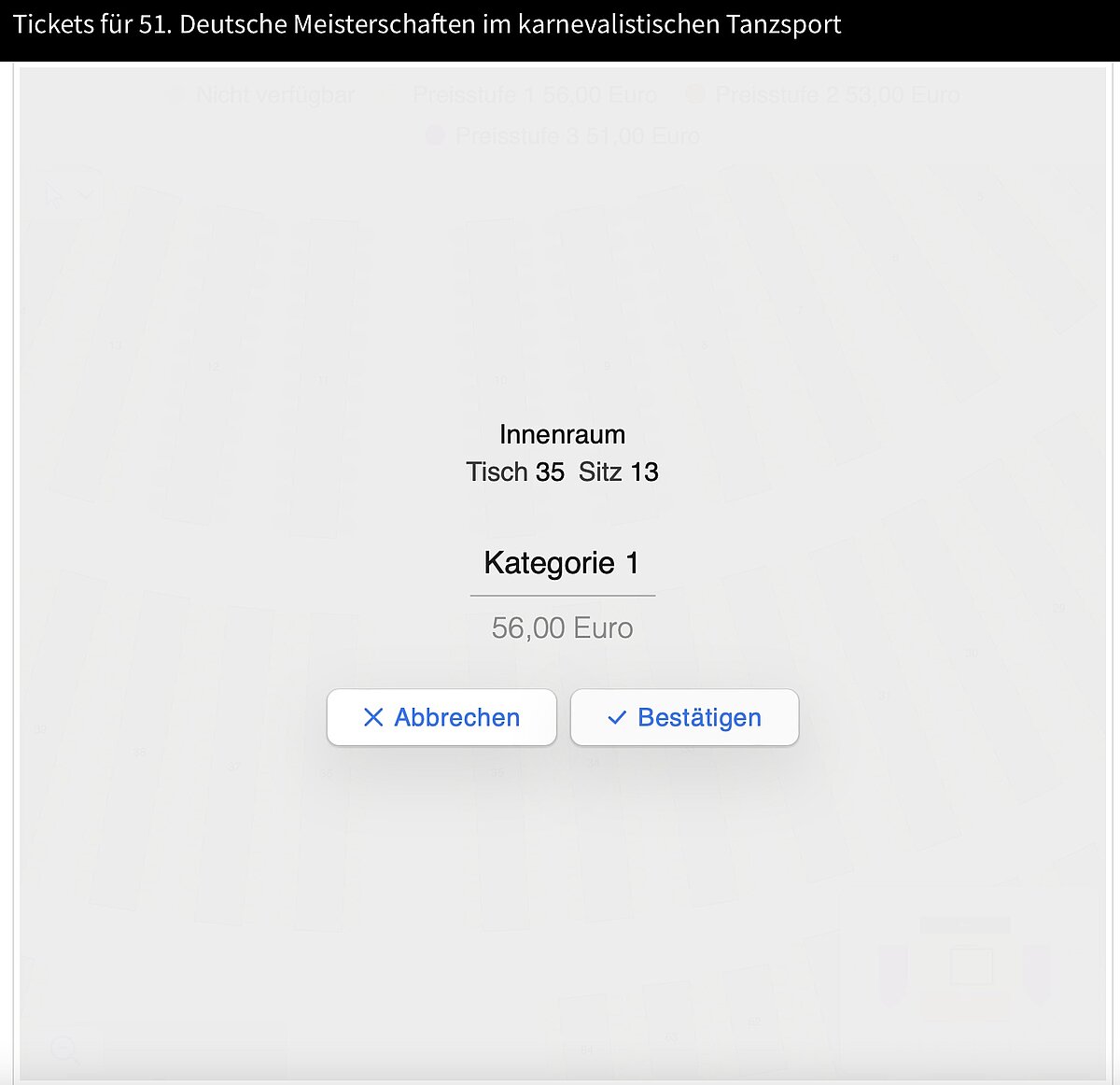 Nachdem Sie die Sitzplätze ausgewählt haben, öffnet sich ein Fenster zur Bestätigung der Bestellung (siehe Foto).